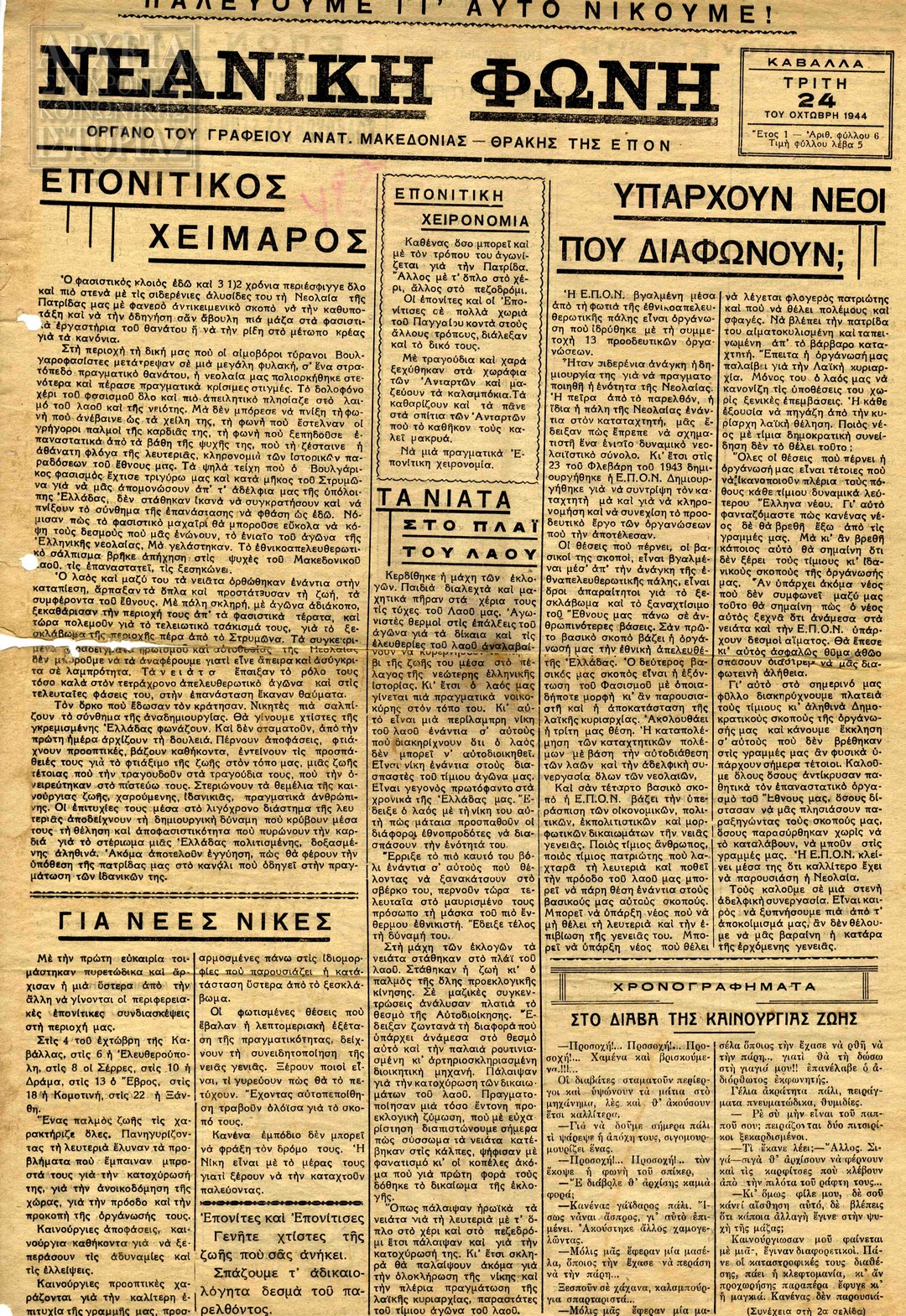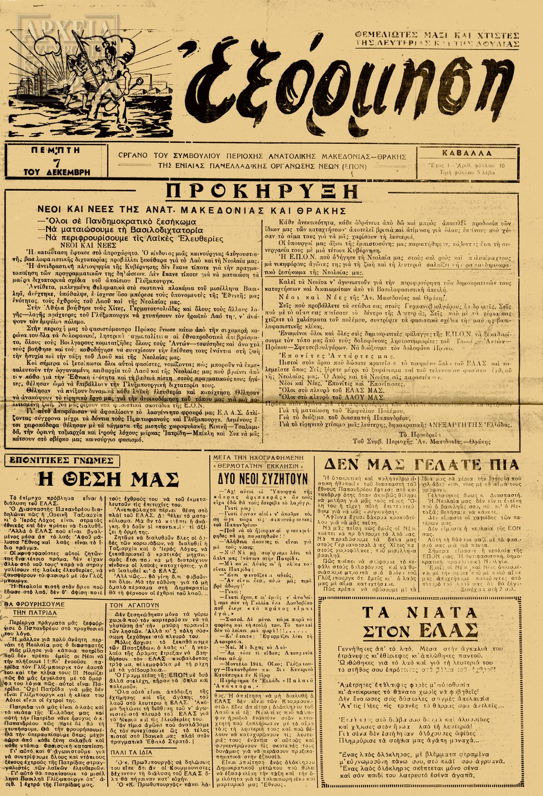 | Υπότιτλος | Όργανο του Συμβουλίου Περιοχής Ανατολικής Μακεδονίας- Θράκης της Ενιαίας Πανελλαδικής Οργάνωσης Νέων (ΕΠΟΝ) |