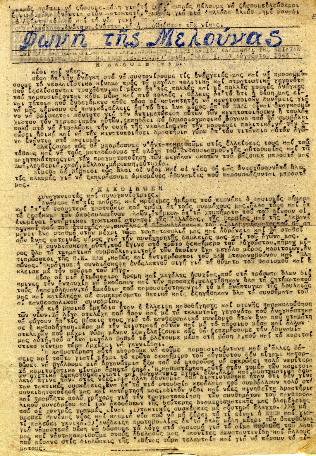 | Υπότιτλος | Όργανο του Επαρχ. Συμβουλίου Ελασσώνας της Ενιαίας Πανελλαδικής Οργάνωσης Νέων (ΕΠΟΝ) |