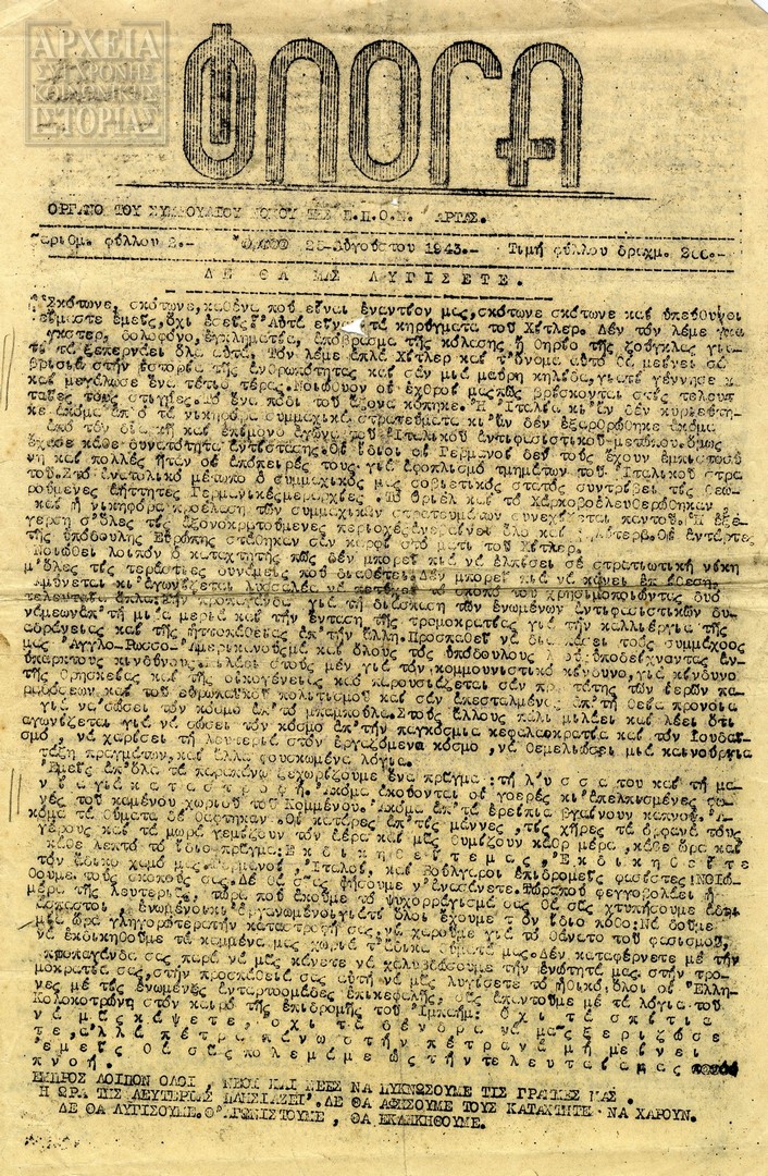 | Θέματα | ΕΔΕΣ (Εθνικός Δημοκρατικός Ελληνικός Σύνδεσμος) ΠΕΕΑ (Πολιτική Επιτροπή Εθνικής Απελευθέρωσης) ΕΠΟΝ (Ενιαία Πανελλαδική Οργάνωση Νέων) Ε.Π.Ο.Ν. / Τύπος Ε.Π.Ο.Ν. / Εκπολιτιστική δράση - εξωραΐστικά έργα Ε.Π.Ο.Ν. / Κοινωνική δραστηριότητα |
