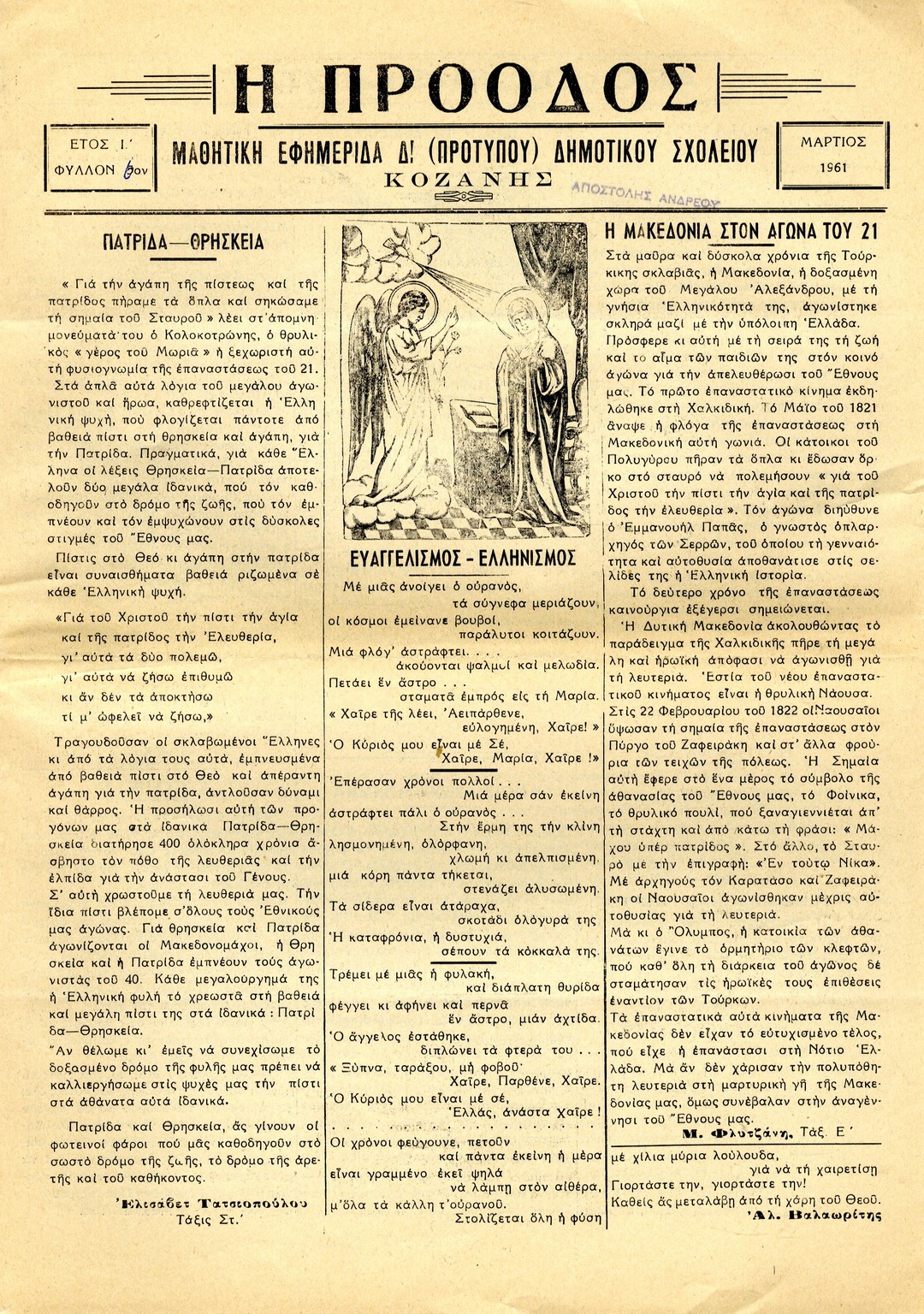 | Θέμα ως θέμα | Χριστιανική διδασκαλία Θρησκευτικές γιορτές Πολιτιστική δραστηριότητα Εκπαίδευση / Πρωτοβάθμια Χριστιανικά έθιμα Μαθητικός Τύπος Ελληνική Επανάσταση 1821 / επέτειος Μαθητές / Μαθήτριες |