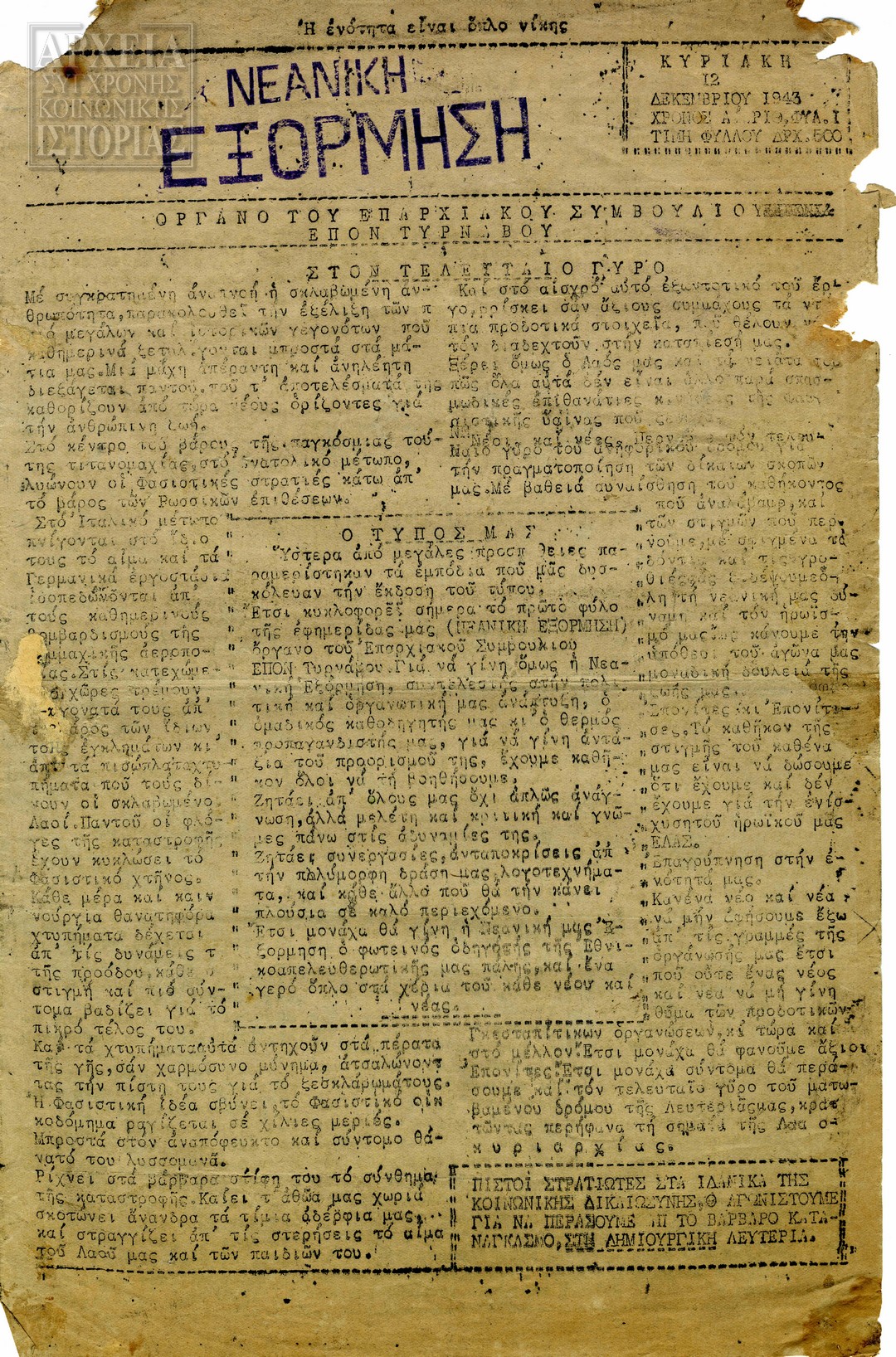 | Εκδότης | ΕΠΟΝ / Επαρχιακό Συμβούλιο Τυρνάβου |