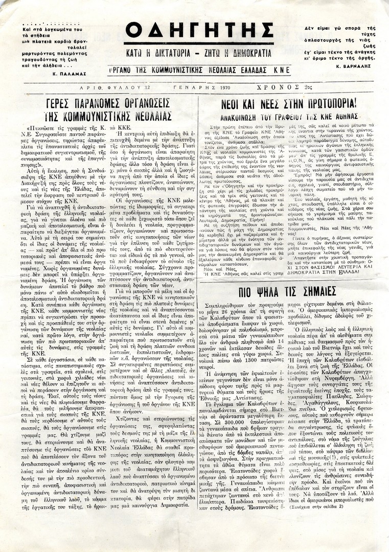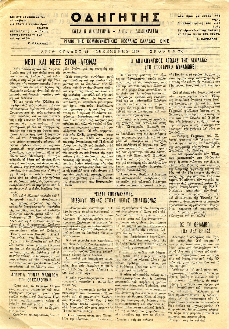 | Θέμα ως θέμα | Πολιτικές νεολαίες Αντιδικτατορικό κίνημα Έλληνες πολιτικοί κρατούμενοι Βιετνάμ / πόλεμος Δικτατορία 21ης Απριλίου 1967 / Οικονομικά στοιχεία ΕΣΣΔ / επέτειος ίδρυσης Αντιδικτατορικός Τύπος εσωτερικού Αντιαμερικανισμός Δικτατορία 21ης Απριλίου 1967 / Συλλήψεις |