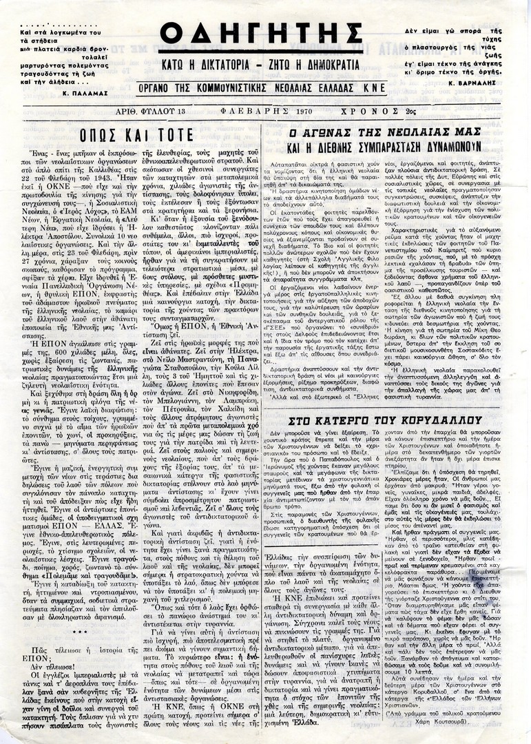 | Θέμα ως θέμα | Πολιτικές νεολαίες Αντιδικτατορικό κίνημα ΕΠΟΝ / Επέτειος ίδρυσης Έλληνες πολιτικοί κρατούμενοι Δικτατορία 21ης Απριλίου 1967 Διεθνής συμπαράσταση Φυλακές Κορυδαλλού Αντιδικτατορικός Τύπος εσωτερικού Δικτατορία 21ης Απριλίου 1967 / Πολιτικές διώξεις Αντιδικτατορικό κίνημα / Δίκες μελών Εθνική Αντίσταση 1941-1944 / Μνήμη Δράσεις αλληλεγγύης Ακροδεξιές οργανώσεις / πολιτική βία |