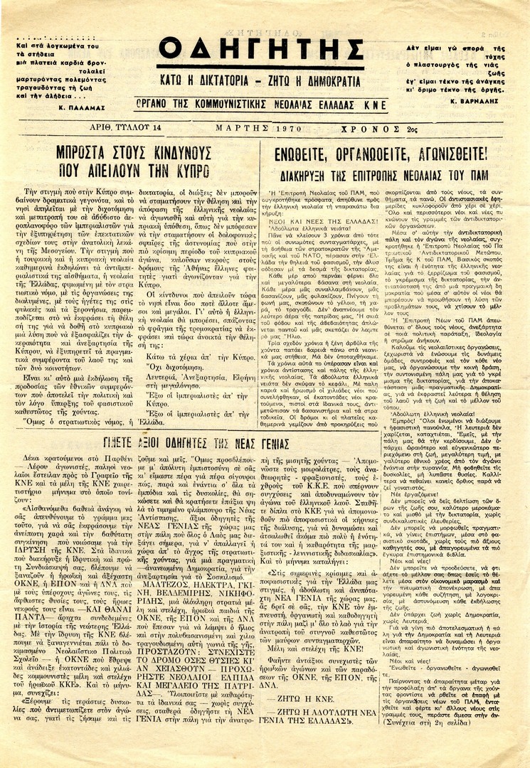 | Θέμα ως θέμα | Πολιτικές νεολαίες Αντιδικτατορικό κίνημα Δικτατορία 21ης Απριλίου 1967 Αντιδικτατορικός Τύπος εσωτερικού Ελληνική Επανάσταση 1821 / επέτειος Αντιαμερικανισμός Ελληνική Επανάσταση 1821 / Μνήμη |