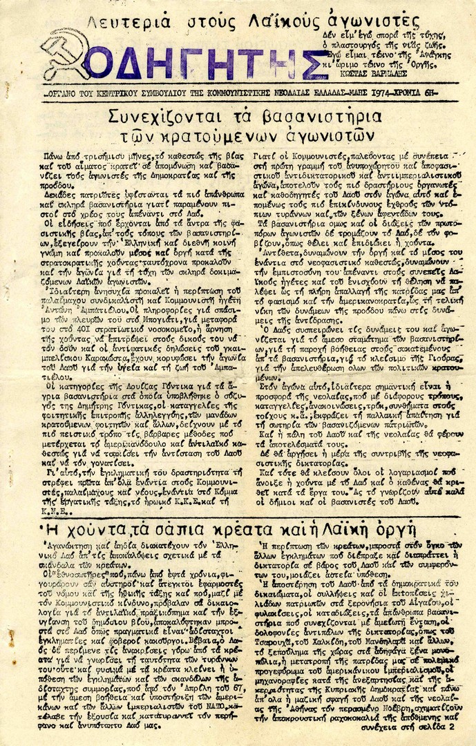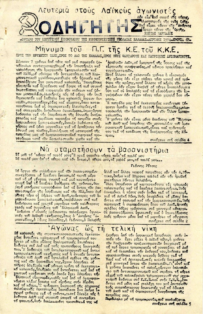 | Θέματα | ΚΚΕ (Κομμουνιστικό Κόμμα Ελλάδας) ΠΑΜ (Πατριωτικό Αντιδικτατορικό Μέτωπο) ΕΠΟΝ (Ενιαία Πανελλαδική Οργάνωση Νέων) ΚΝΕ (Κομμουνιστική Νεολαία Ελλάδας) |