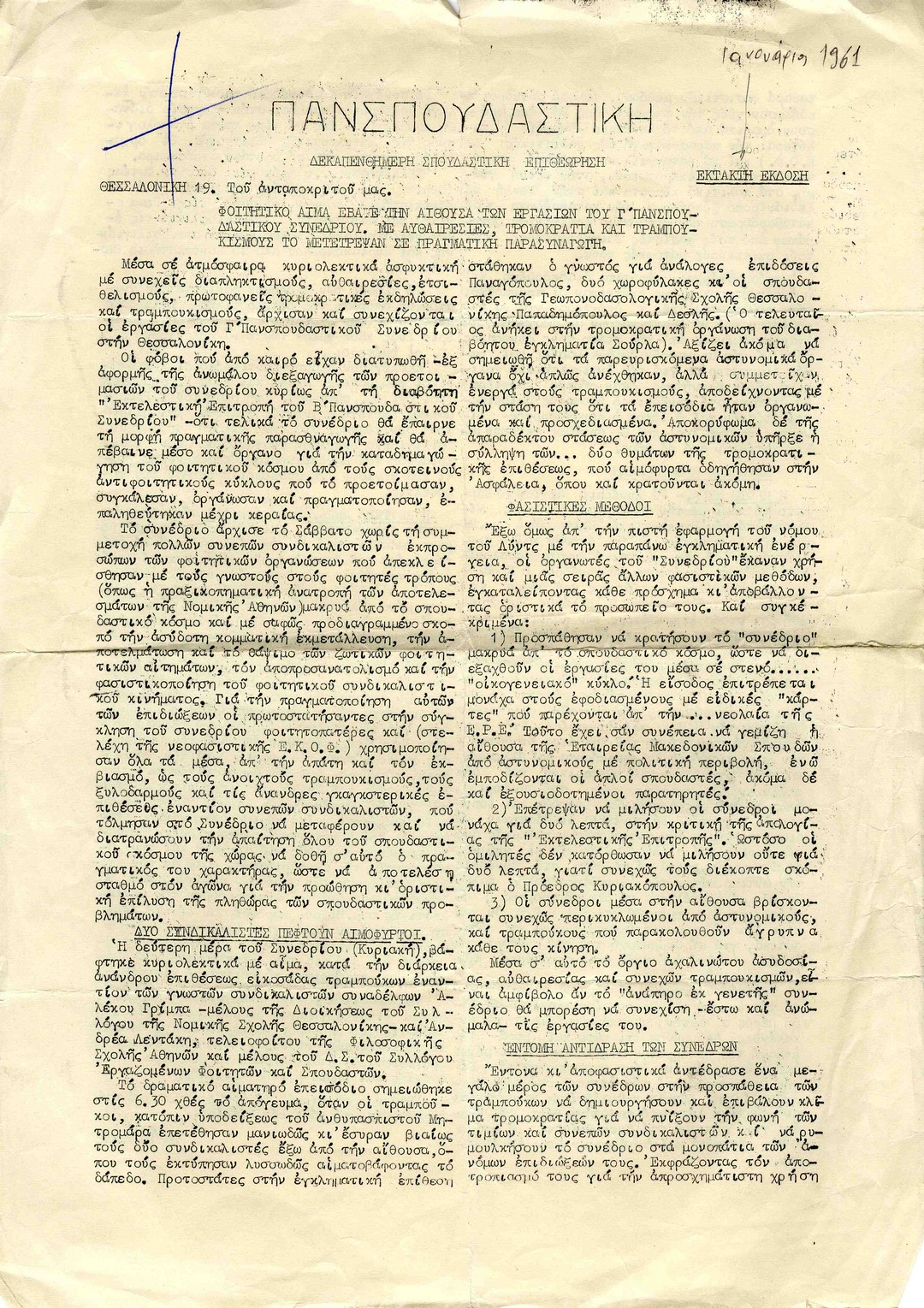 | Θέμα ως θέμα | Εκπαιδευτικά ζητήματα Εκπαίδευση / Τριτοβάθμια Φοιτητικός τύπος Πανσπουδαστικό Συνέδριο (3ο) Διεθνές φοιτητικό κίνημα Φοιτητικό κίνημα / διεκδικήσεις Φοιτητικό κίνημα / Σπουδαστικά ζητήματα Φοιτητικοί σύλλογοι Ακροδεξιές οργανώσεις / πολιτική βία |