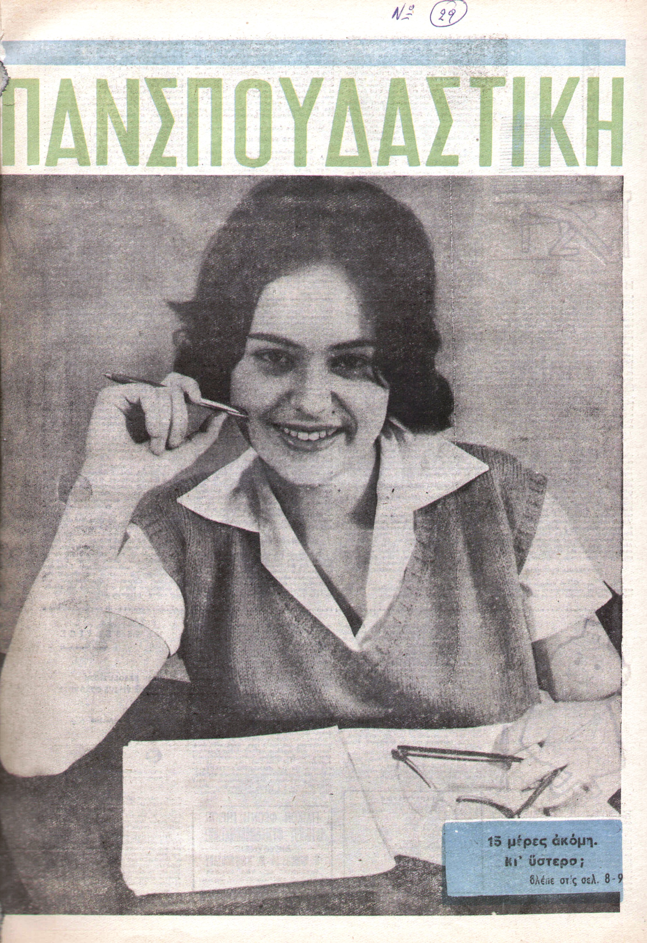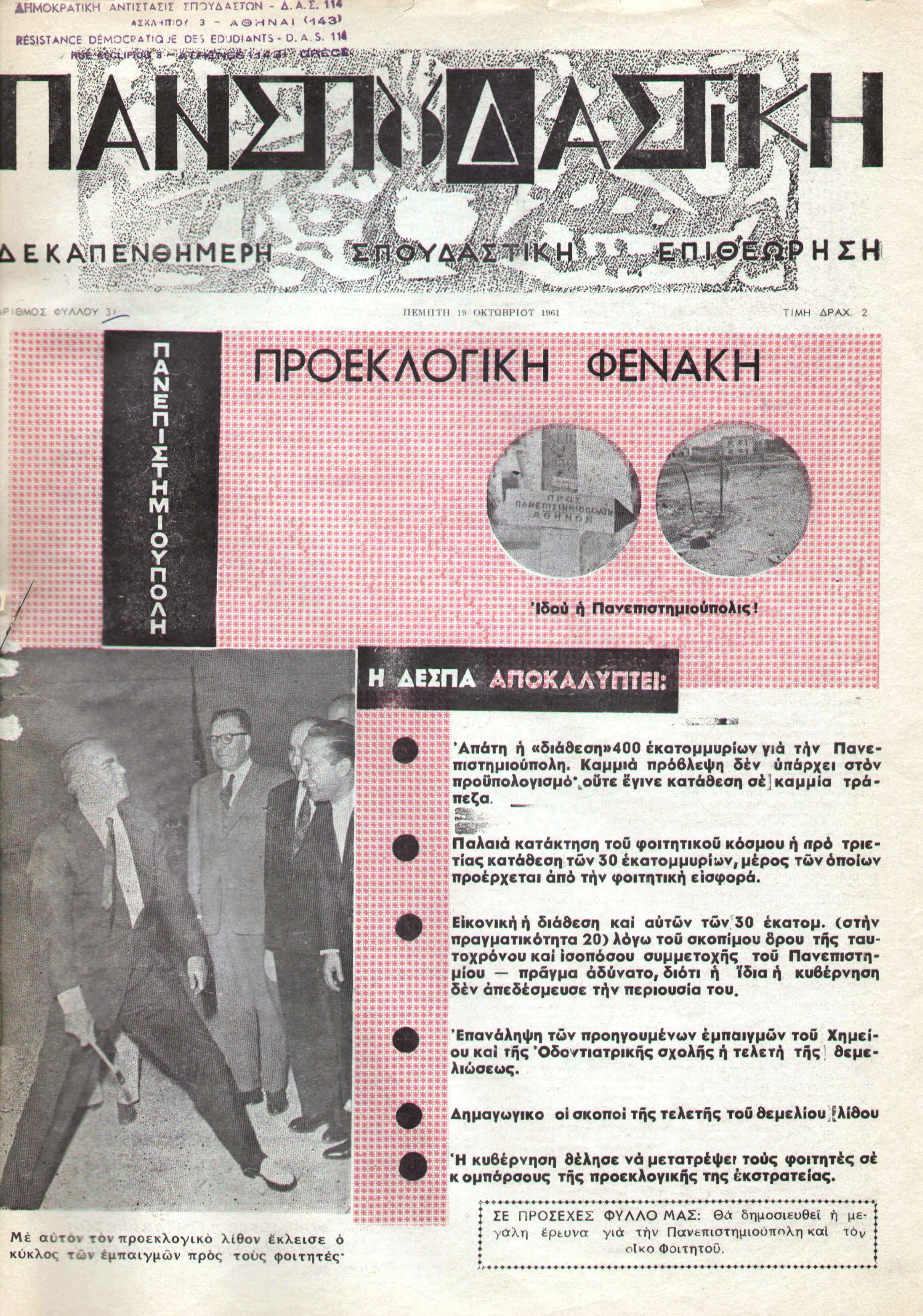 | Θέμα ως θέμα | Εκπαίδευση / Δευτεροβάθμια Εκπαιδευτική πολιτική Εκπαιδευτικά ζητήματα 28η Οκτωβρίου / επέτειος ΑΕΙ / Πανεπιστημιούπολη Αθηνών Εκπαίδευση / Τεχνική Εκπαίδευση / Τριτοβάθμια Προεκλογική εκστρατεία Φοιτητικός τύπος Πανελλαδική Έκθεση Νέων (1η) Βουλευτικές εκλογές 1961 Εργαζόμενοι μαθητές Φοιτητικό κίνημα / διεκδικήσεις Φοιτητικό κίνημα / Σπουδαστικά ζητήματα Νυχτερινά Σχολεία / 7ος χρόνος φοίτησης Φοιτητικός Συνδικαλισμός Αστυνομία / Καταστολή Ακροδεξιές οργανώσεις / πολιτική βία Μαθητικό κίνημα / διεκδικήσεις |
