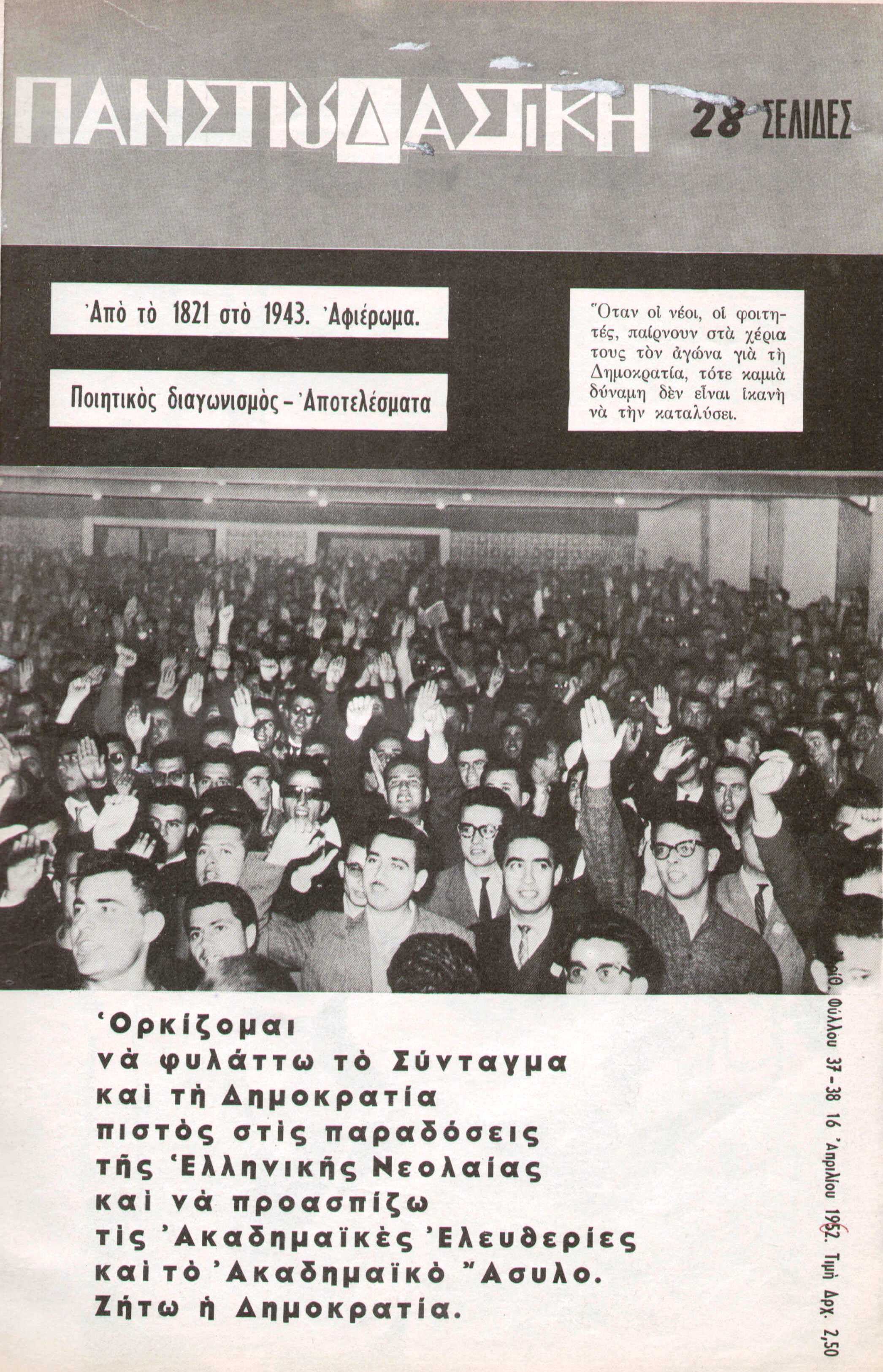 | Θέματα | ΕΚΟΦ (Εθνική Κοινωνική Οργάνωσις Φοιτητών) ΔΕΣΠΑ (Διοικούσα Επιτροπή Συλλόγων Πανεπιστημίου Αθηνών) ΙΚΥ (Ίδρυμα Κρατικών Υποτροφιών) ΑΠΘ / Φοιτητική Εβδομάδα |