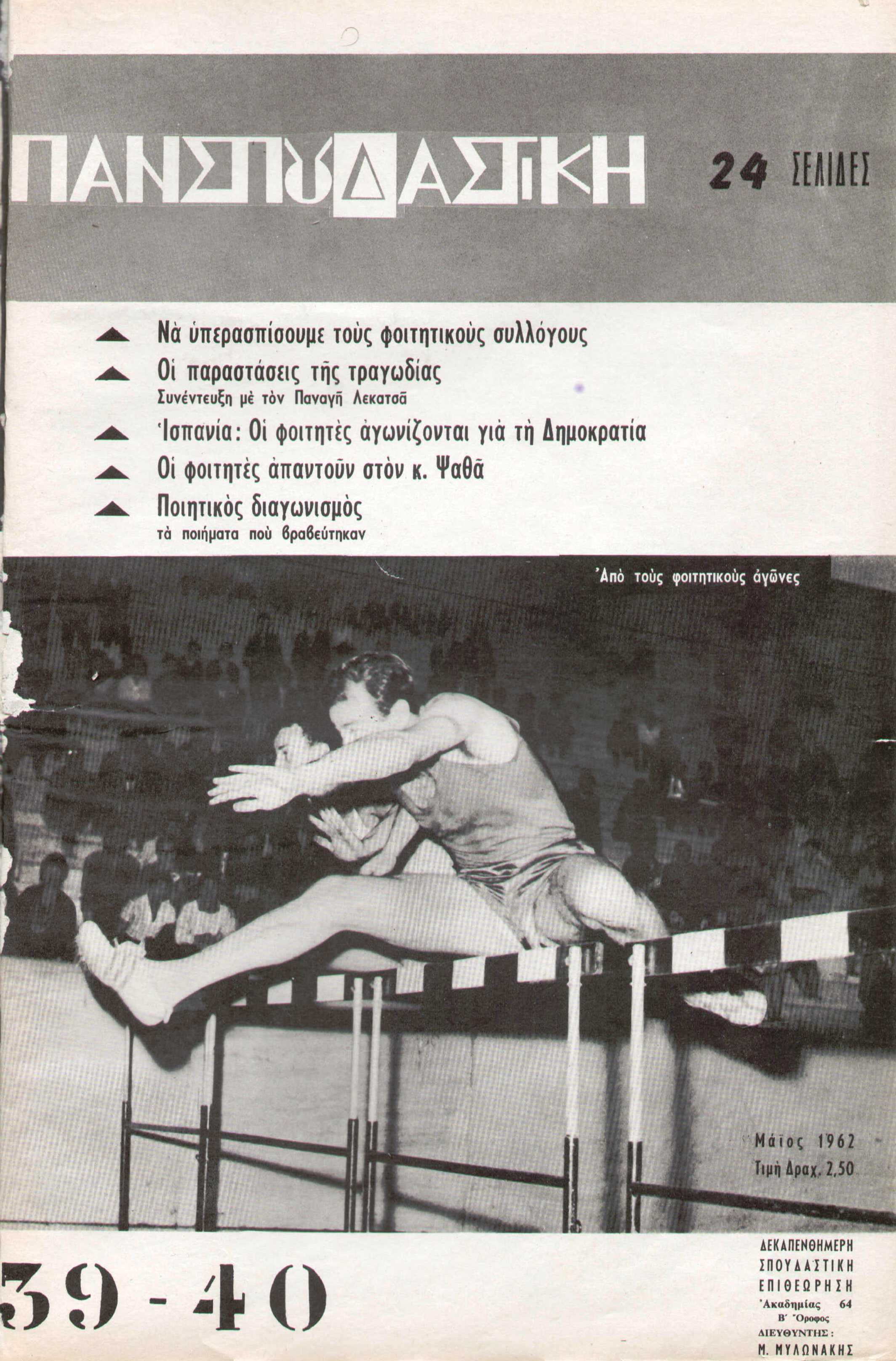 | Θέμα ως θέμα | Εικαστικές Τέχνες Αρχαία ελληνική τραγωδία Ελληνικό χορόδραμα Κρητική Επανάσταση Αθλητικές εκδηλώσεις / αθλητικοί αγώνες Εκπαιδευτική πολιτική Εκπαιδευτικά ζητήματα Διαγωνισμός ποίησης Εκπαίδευση / Τριτοβάθμια Παγκόσμιο Φεστιβάλ Νεολαίας και Σπουδαστών (8ο, Ελσίνκι, 7-8/1962) Φοιτητικός τύπος Φοιτητικό κίνημα / διεκδικήσεις Φοιτητικό κίνημα / Σπουδαστικά ζητήματα Ισπανία / διώξεις φοιτητών Εκπαίδευση / εκδημοκρατισμός Φοιτητικό κίνημα / εκλογές Φοιτητικό κίνημα / Ιστορία Φοιτητικοί σύλλογοι Αστυνομία / Καταστολή Ακροδεξιές οργανώσεις / πολιτική βία |