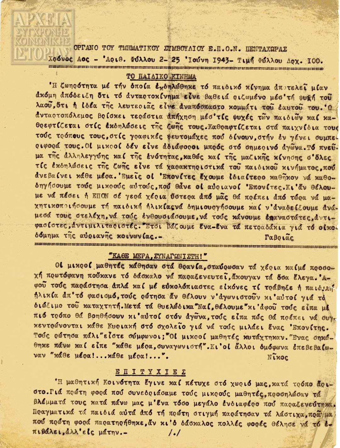 | Εκδότης | ΕΠΟΝ / Τμηματικό Συμβούλιο Πενταχώρας |