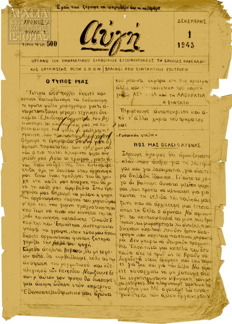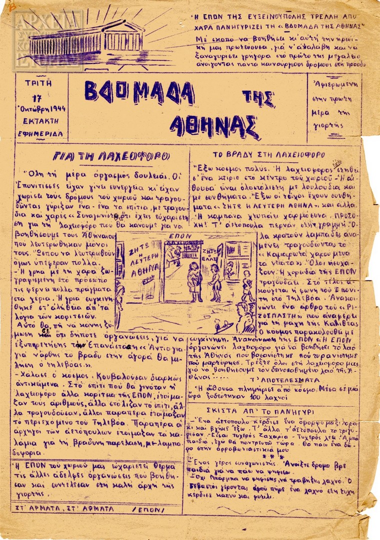 | Υπότιτλος | Έκδοση του τμηματικού Συμβουλίου ΕΠΟΝ Αλμυρού αφιερωμένη στους αγώνες του αθηναϊκού λαού για την απελευθέρωσή του |
