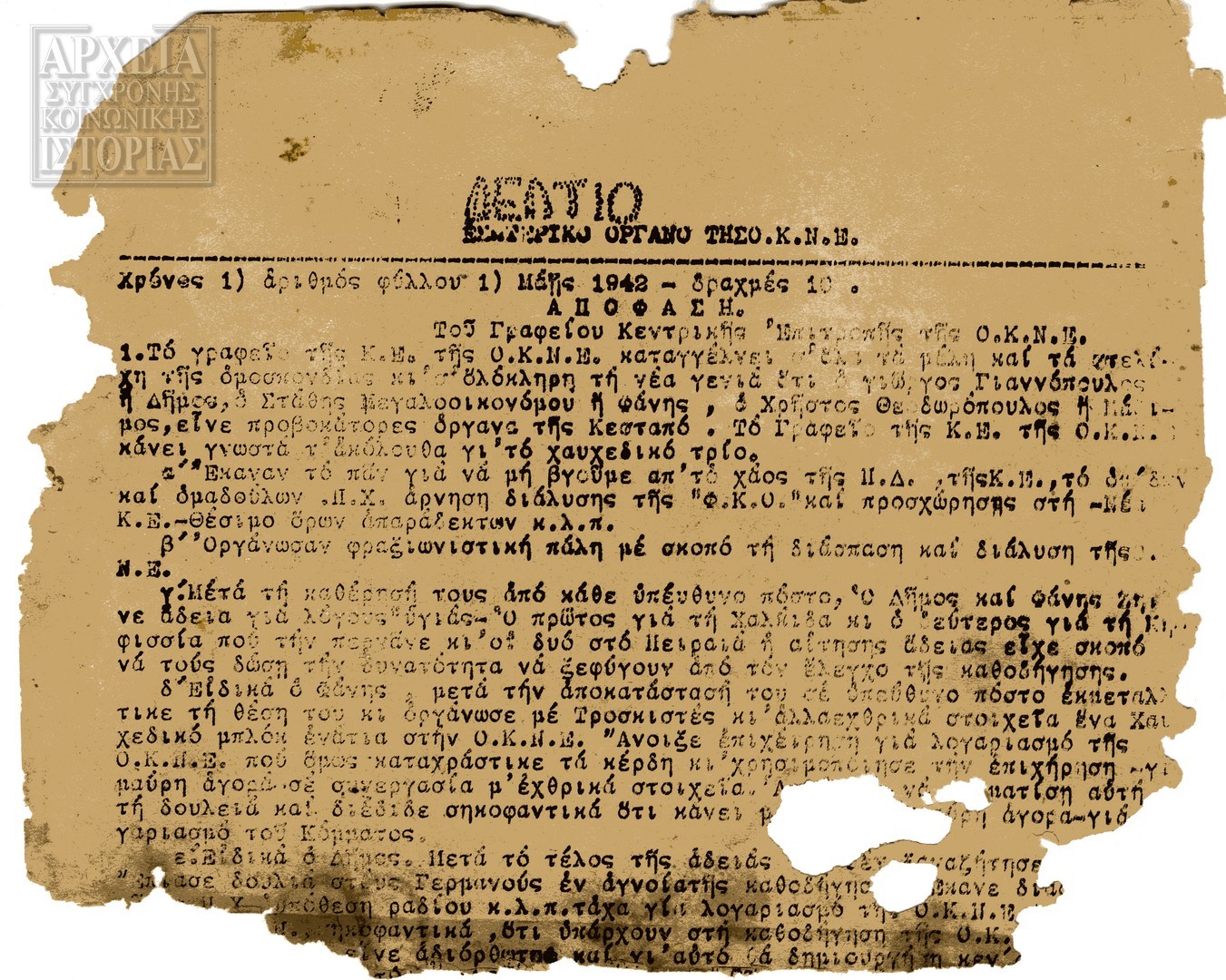 | Θέμα ως θέμα | Κατοχή - Αντίσταση Αντιστασιακός τύπος ΕΠΟΝ / Συνδιασκέψεις ΕΠΟΝ / θύματα αντίστασης Αντιστασιακές οργανώσεις Γερμανική Κατοχή / εκτελέσεις |