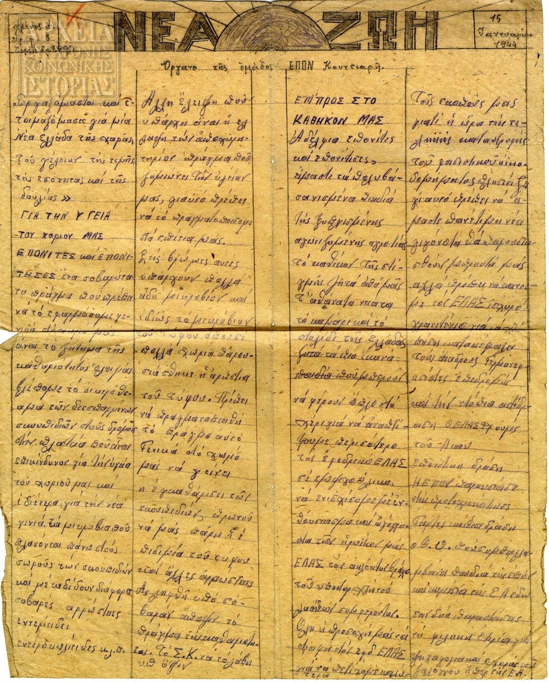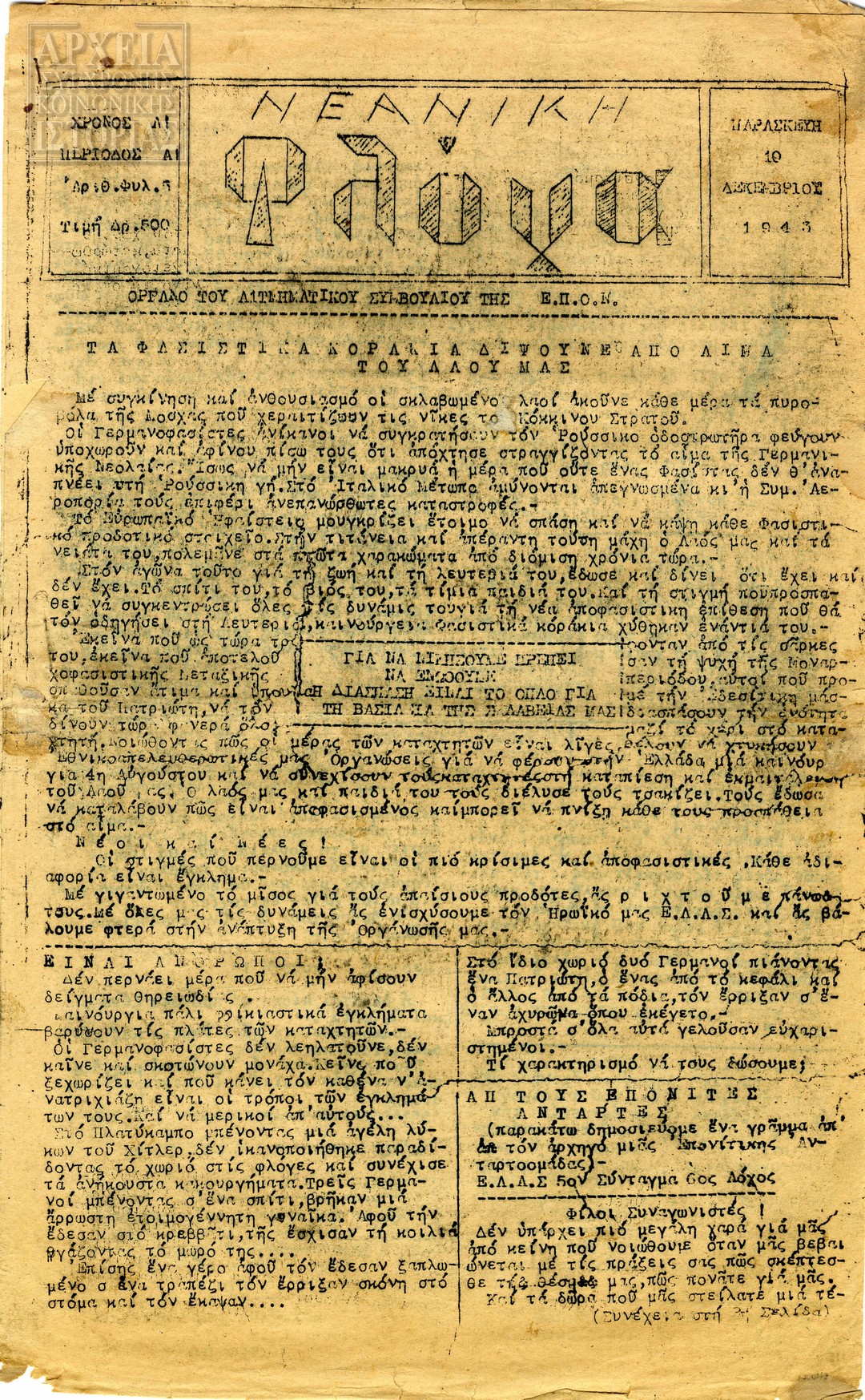 | Θέματα | ΕΛΑΣ (Ελληνικός Λαϊκός Απελευθερωτικός Στρατός) ΕΑΜ (Εθνικό Απελευθερωτικό Μέτωπο) ΕΠΟΝ (Ενιαία Πανελλαδική Οργάνωση Νέων) ΕΠΟΝ / Νομαρχιακά Συμβούλια ΕΠΟΝ / Τύπος ΕΠΟΝ / Εκπολιτιστική δράση - εξωραΐστικά έργα Πάτρα Μακεδονία Καβάλα |