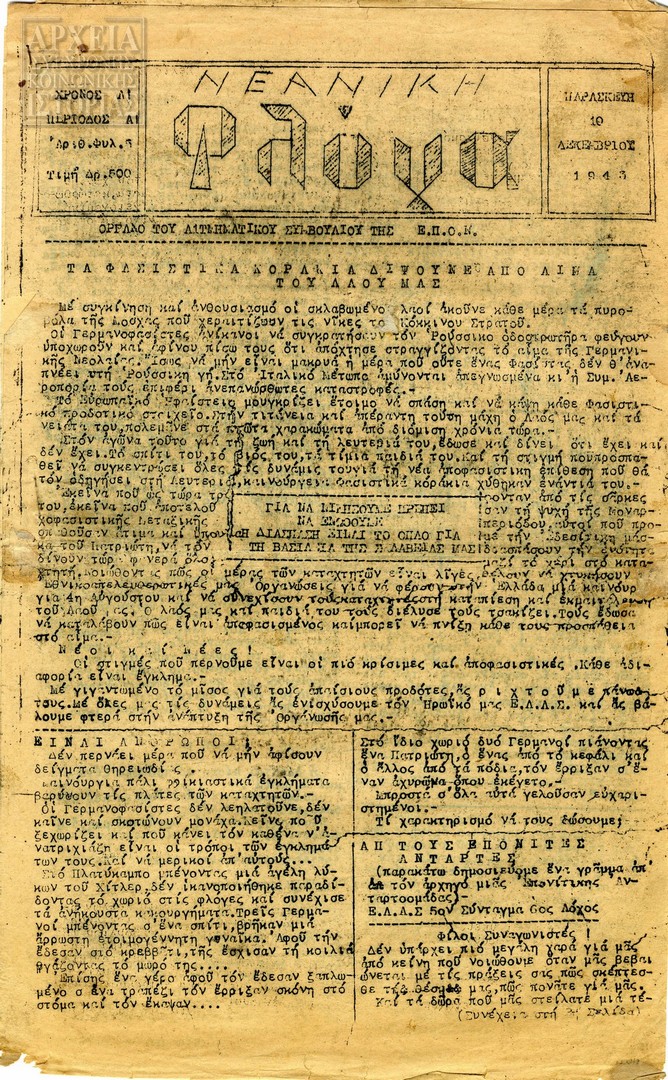 | Θέματα | ΕΛΑΣ (Ελληνικός Λαϊκός Απελευθερωτικός Στρατός) ΕΠΟΝ (Ενιαία Πανελλαδική Οργάνωση Νέων) |