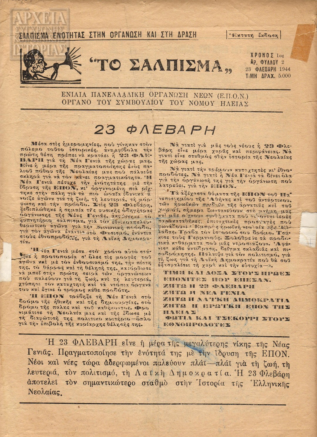 | Υπότιτλος | Ενιαία Πανελλαδική Όργάνωση Νέων, Όργανο του Συμβουλίου του Νομού Ηλείας |