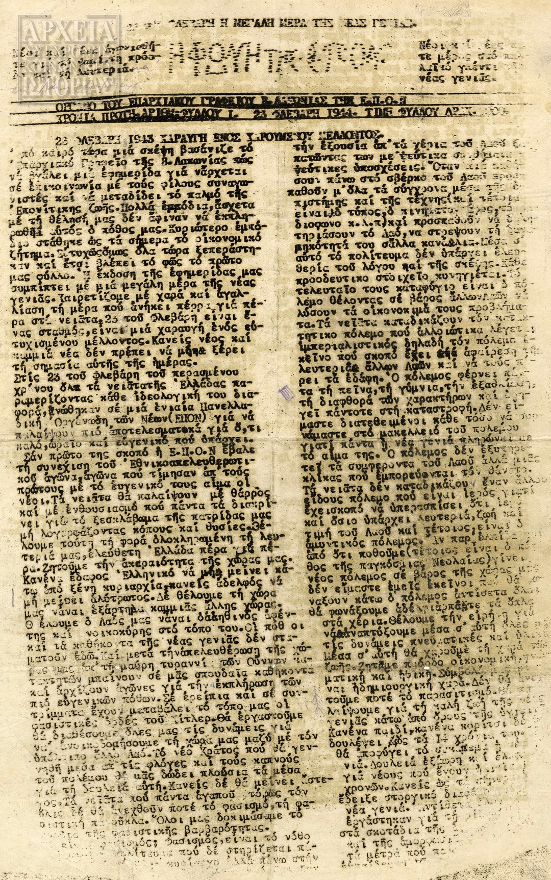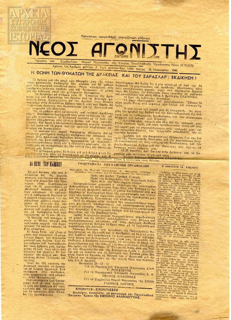 | Υπότιτλος | Όργανο του Συμβουλίου Νομού Μαγνησίας της Ενιαίας Πανελλαδικής Οργάνωσης Νέων (Ε.Π.Ο.Ν.) |