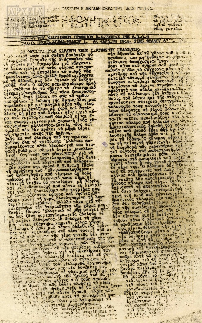 | Θέμα ως θέμα | Εθνική Αντίσταση Σχόλια επικαιρότητας Εμφύλιος πόλεμος ΕΠΟΝ / Επέτειος ίδρυσης Ε.Π.Ο.Ν. / Δραστηριότητα οργανώσεων |