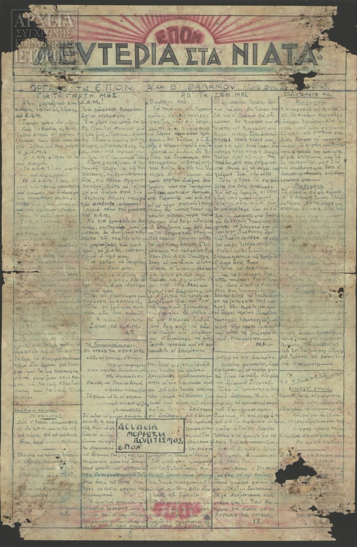 | Θέματα | ΕΑΜ (Εθνικό Απελευθερωτικό Μέτωπο) ΕΠΟΝ (Ενιαία Πανελλαδική Οργάνωση Νέων) |