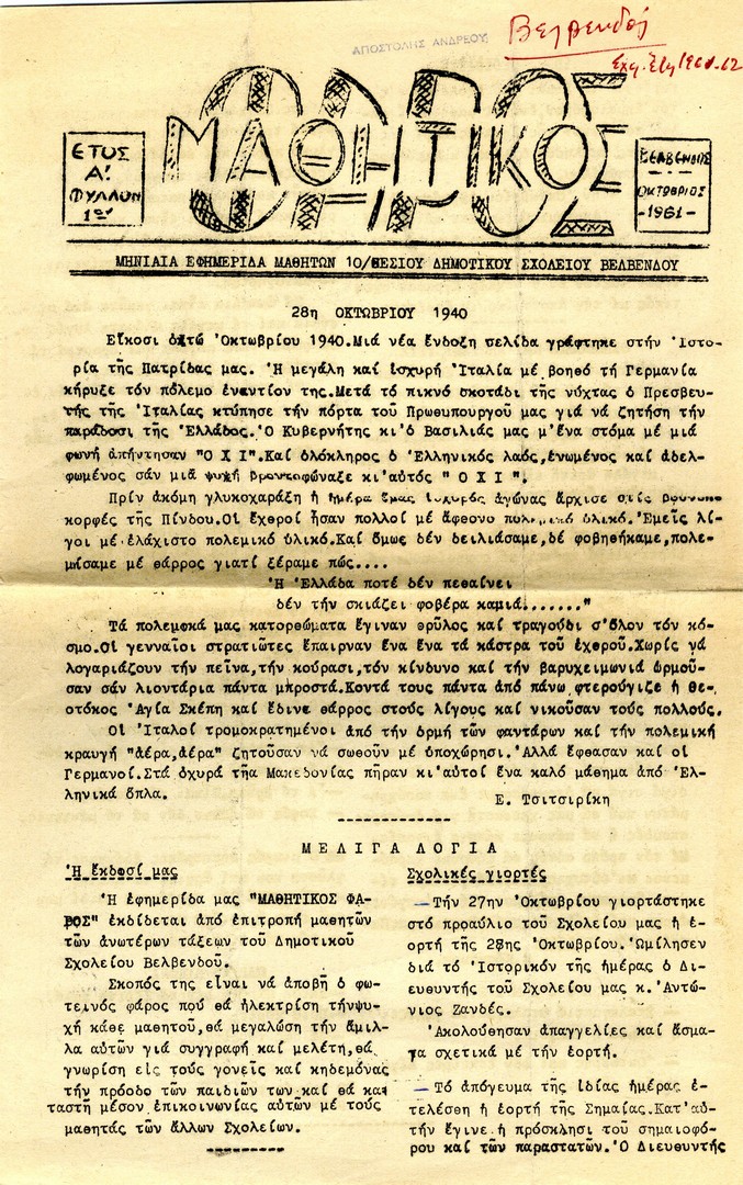 | Θέμα ως θέμα | 28η Οκτωβρίου / επέτειος Εκπαίδευση / Πρωτοβάθμια Μαθητικός Τύπος Μαθητές / Μαθήτριες |