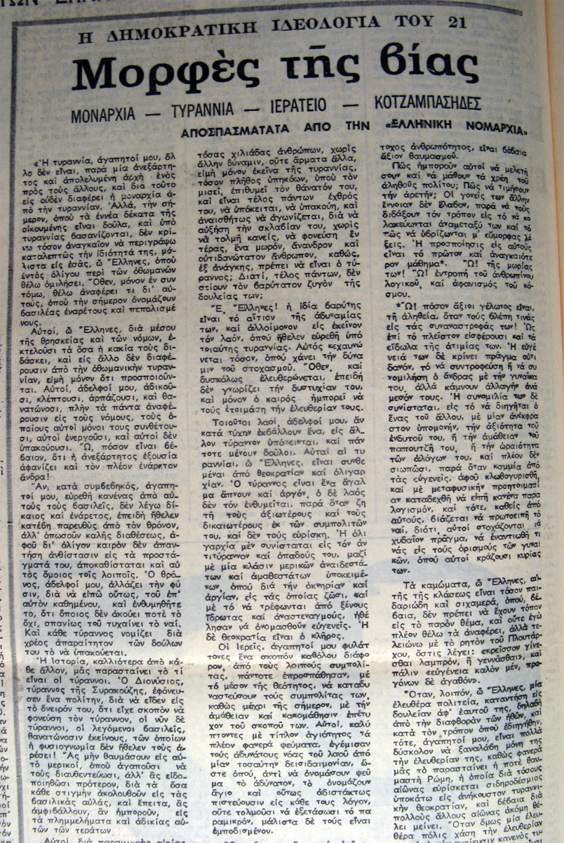 | Τίτλος | Η δημοκρατική ιδεολογία του 21.Μορφές της βίας-μοναρχία-τυρρανία-ιερατείο-κοτζαμπάσηδες |