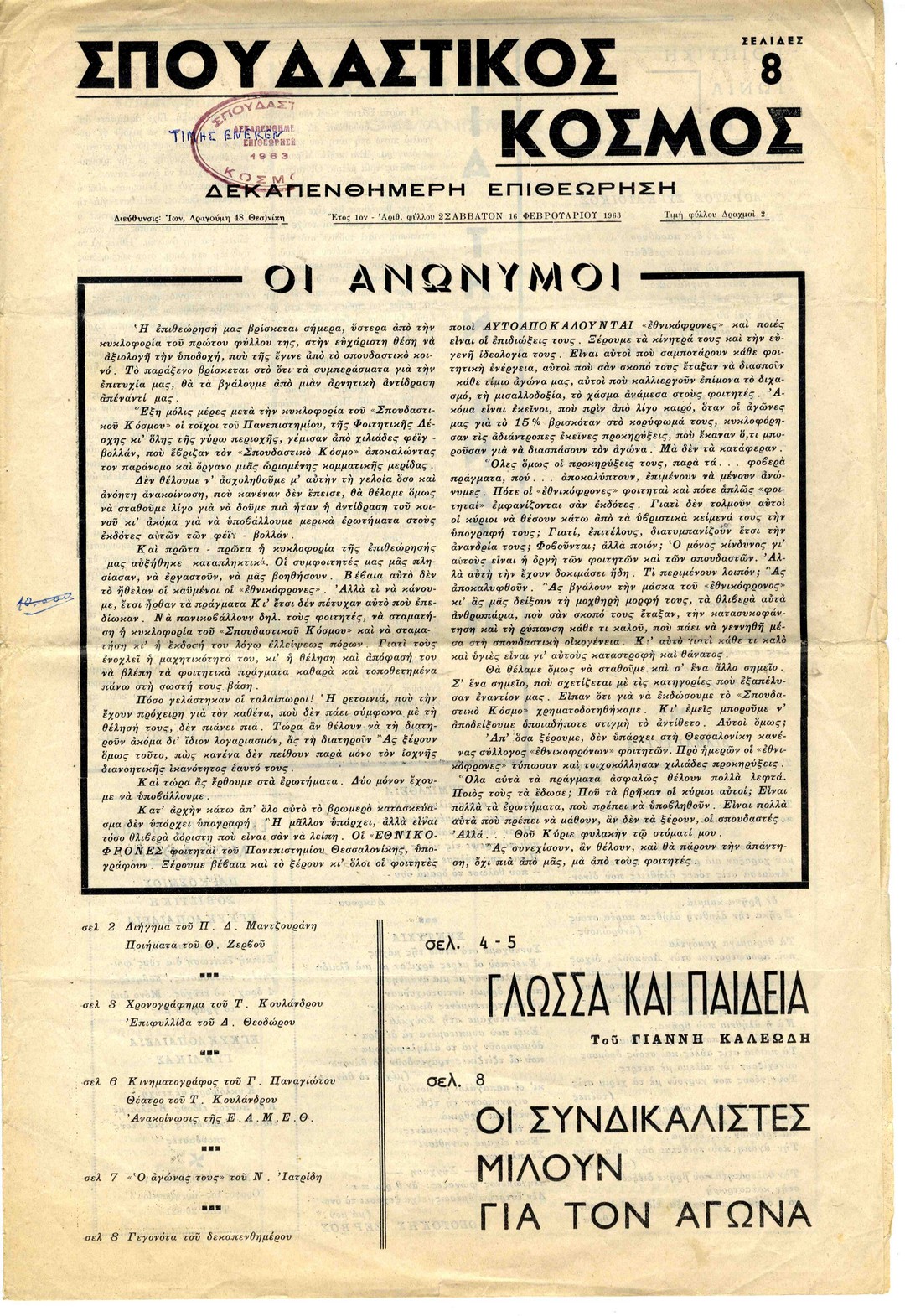| Θέμα ως θέμα | Αντιπολεμικό κίνημα Βουλευτικές εκλογές 1964 Εκπαιδευτικά ζητήματα Δολοφονία Τζων Κέννεντυ Εκπαίδευση / Τριτοβάθμια Φοιτητικός τύπος Φοιτητικό κίνημα / διεκδικήσεις Εκπαίδευση / εκδημοκρατισμός Εθνική Αντίσταση 1941-1944 / Μνήμη |