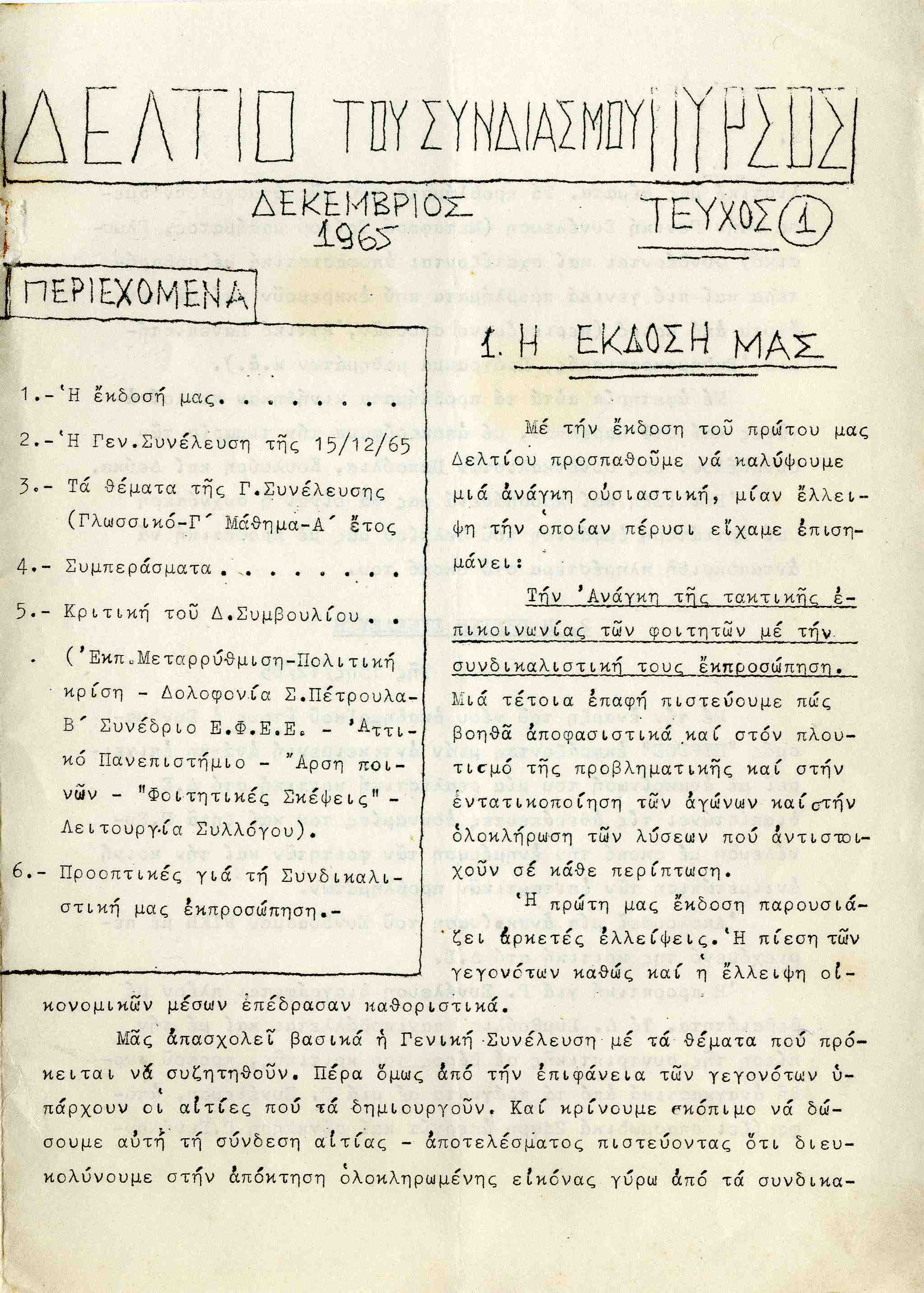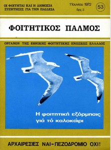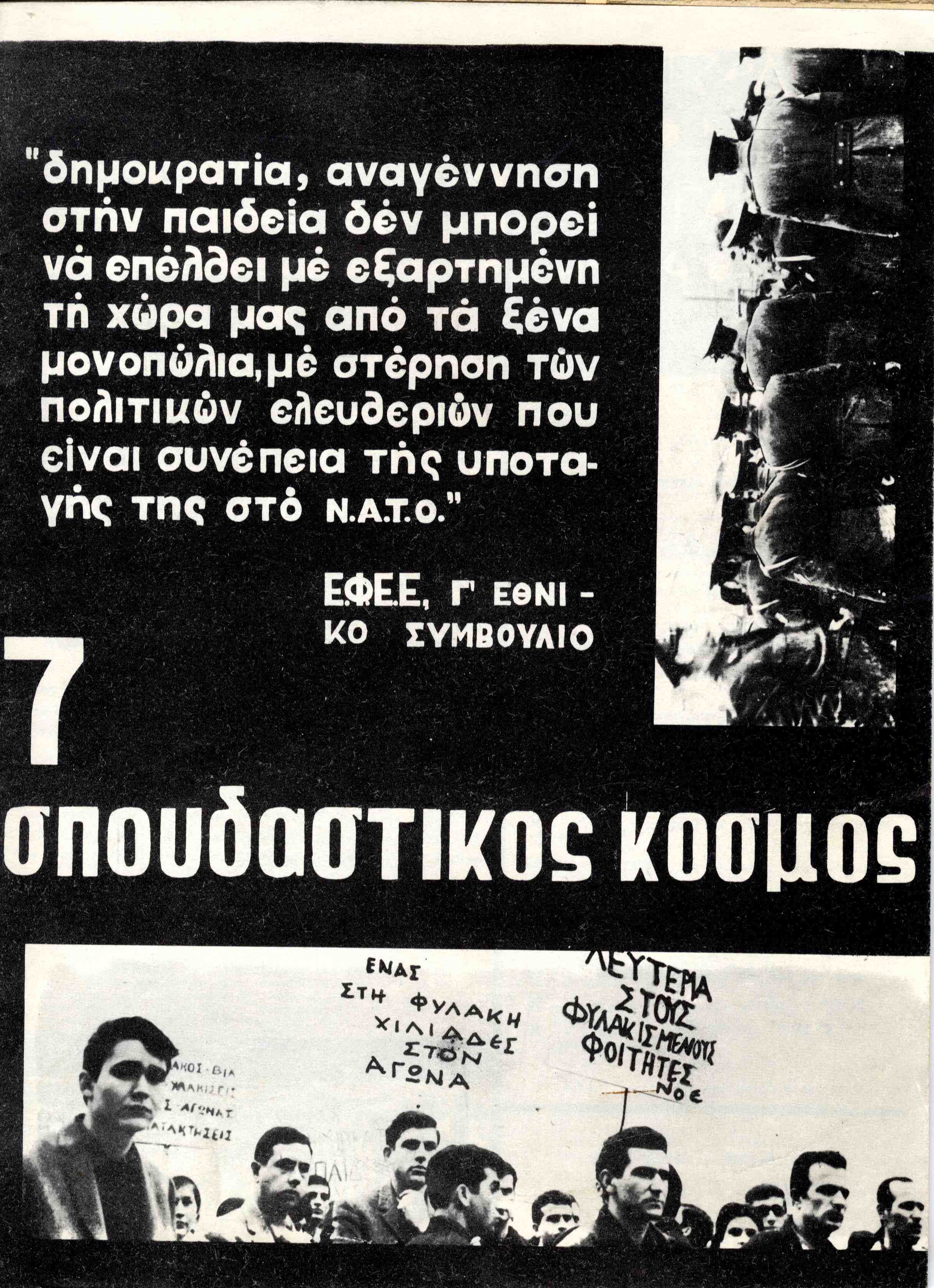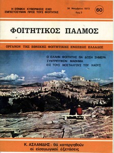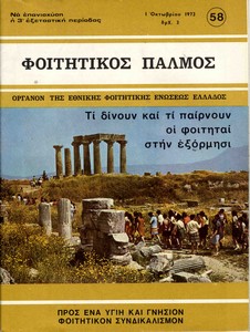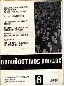| Θέματα | ΕΦΕΕ (Εθνική Φοιτητική Ένωση Ελλάδος) : Union Nationale des Etudiants Grecs ΔΕΣΠΑ (Διοικούσα Επιτροπή Συλλόγων Πανεπιστημίου Αθηνών) Ανώτατη Βιομηχανική Σχολή / Σύλλογος Σπουδαστών Ανωτάτης Βιομηχανικής Σχολής ΕΣΕΣΙ (Εθνική Συνομοσπονδία Ελλήνων Σπουδαστών Ιταλίας) |