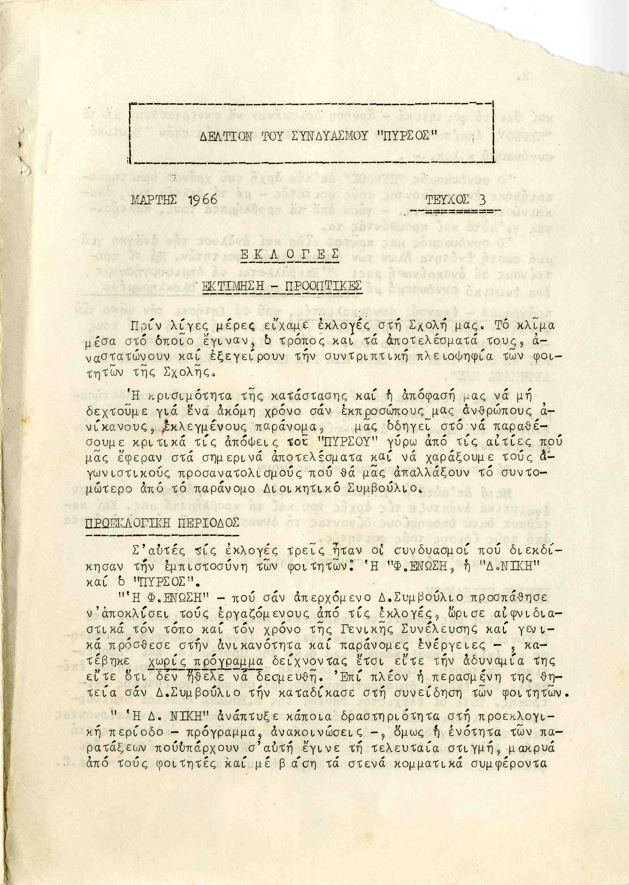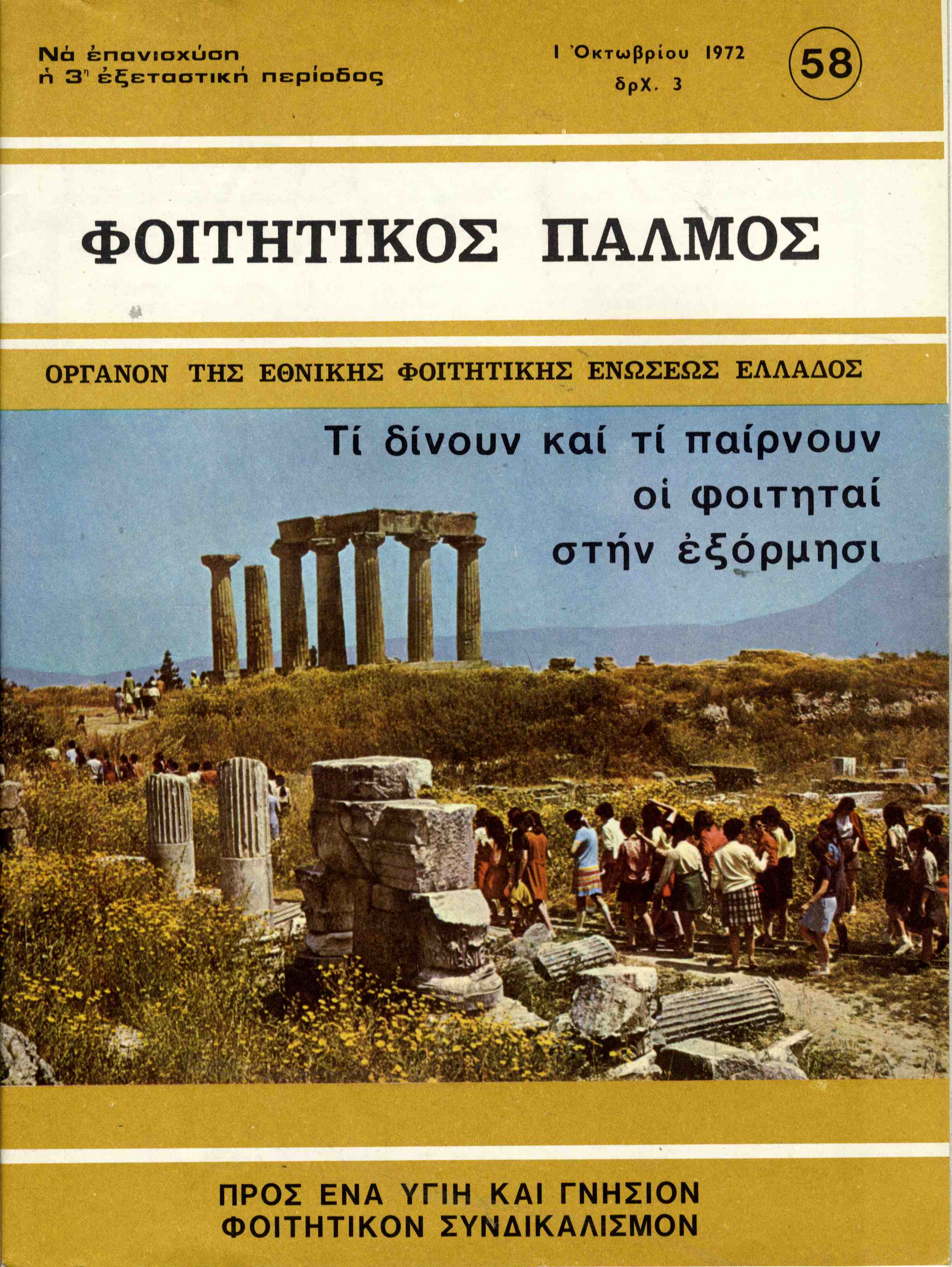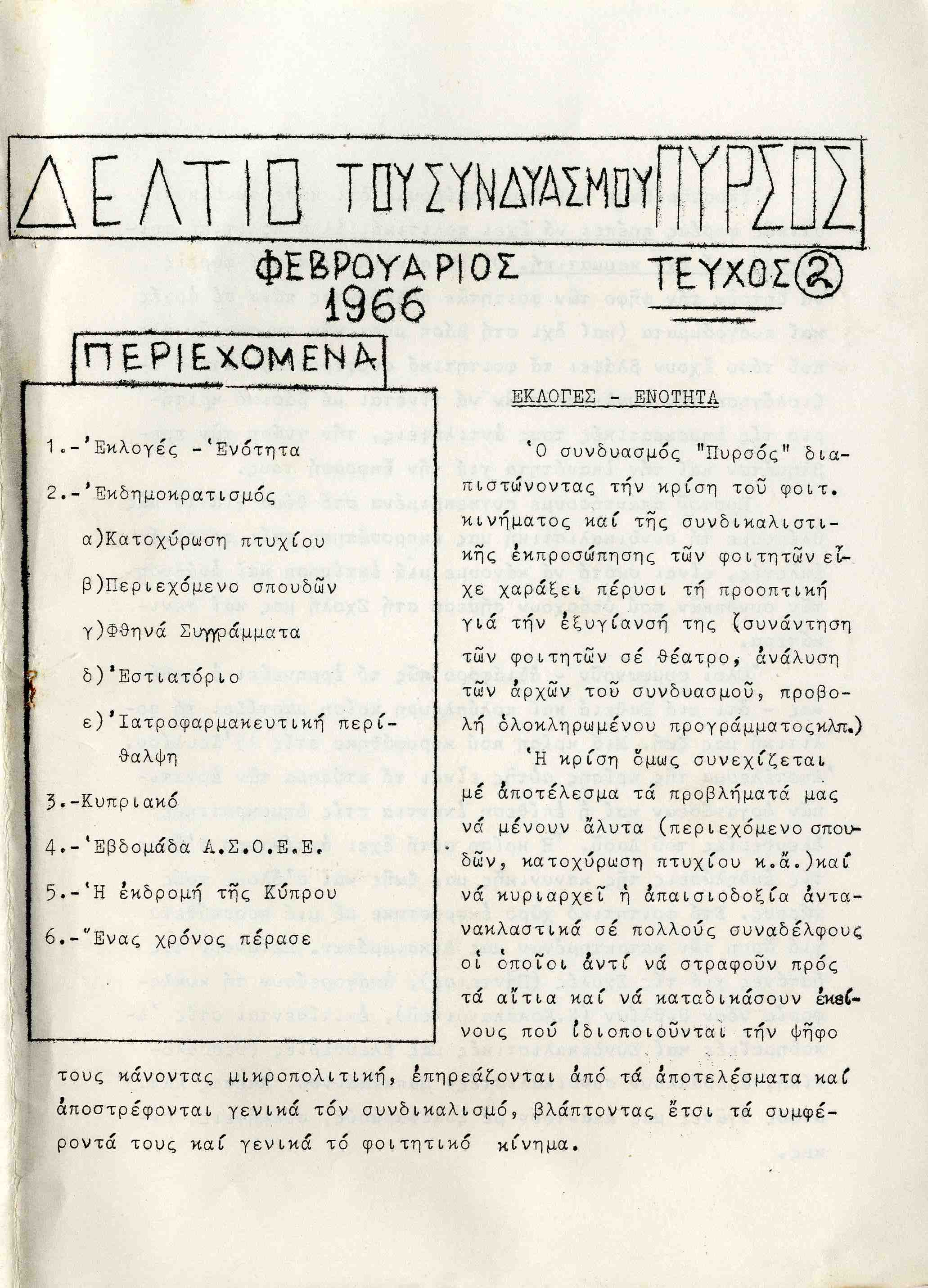 | Θέματα | ΕΦΕΕ (Εθνική Φοιτητική Ένωση Ελλάδος) : Union Nationale des Etudiants Grecs ΔΕΣΠΑ (Διοικούσα Επιτροπή Συλλόγων Πανεπιστημίου Αθηνών) Ανώτατη Βιομηχανική Σχολή / Σύλλογος Σπουδαστών Ανωτάτης Βιομηχανικής Σχολής ΕΣΕΣΙ (Εθνική Συνομοσπονδία Ελλήνων Σπουδαστών Ιταλίας) |