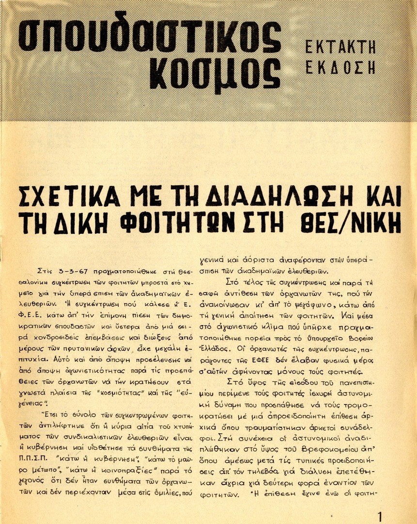 | Θέμα ως θέμα | Δίκη φοιτητών Εκπαίδευση / Τριτοβάθμια Φοιτητικός τύπος Ακαδημαϊκές ελευθερίες Φοιτητικό κίνημα / διεκδικήσεις Φοιτητικό κίνημα / Οργανωτικά ζητήματα Φοιτητικό κίνημα / διώξεις Φοιτητικό κίνημα / Συνδικαλιστικές ελευθερίες Φοιτητικό κίνημα / Διαδηλώσεις Φοιτητικές παρατάξεις Φοιτητικός Συνδικαλισμός Φοιτητικό κίνημα / Ιδεολογικές αντιθέσεις Εκπαίδευση / εκδημοκρατισμός Φοιτητικοί σύλλογοι Αστυνομία / Καταστολή |
