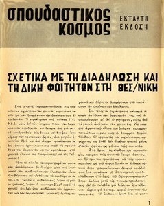 | Θέμα ως θέμα | Ελληνική λογοτεχνία Κριτική κινηματογράφου Έκθεση Σπουδαστών ΑΣΚΤ Εκπαίδευση / Δευτεροβάθμια Εκπαιδευτικά ζητήματα Σπουδαστικό κίνημα Εκπαίδευση / Τεχνική Εκπαίδευση / Τριτοβάθμια Πολιτικές συγκρούσεις Φοιτητικός τύπος Φοιτητικό εισιτήριο Πανσπουδαστικό Συνέδριο (3ο) Φοιτητικό κίνημα / διεκδικήσεις Φοιτητικό κίνημα / Σπουδαστικά ζητήματα Φοιτητικός Συνδικαλισμός Φοιτητικοί σύλλογοι Ακροδεξιές οργανώσεις / πολιτική βία |