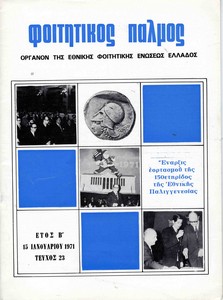 | Θέματα | ΕΦΕΕ (Εθνική Φοιτητική Ένωση Ελλάδος) : Union Nationale des Etudiants Grecs ΔΕΣΠΑ (Διοικούσα Επιτροπή Συλλόγων Πανεπιστημίου Αθηνών) ΕΦΕΕ / Εκπολιτιστική δράση Σύλλογος σπουδαστών υπομηχανικών Αθηνών |