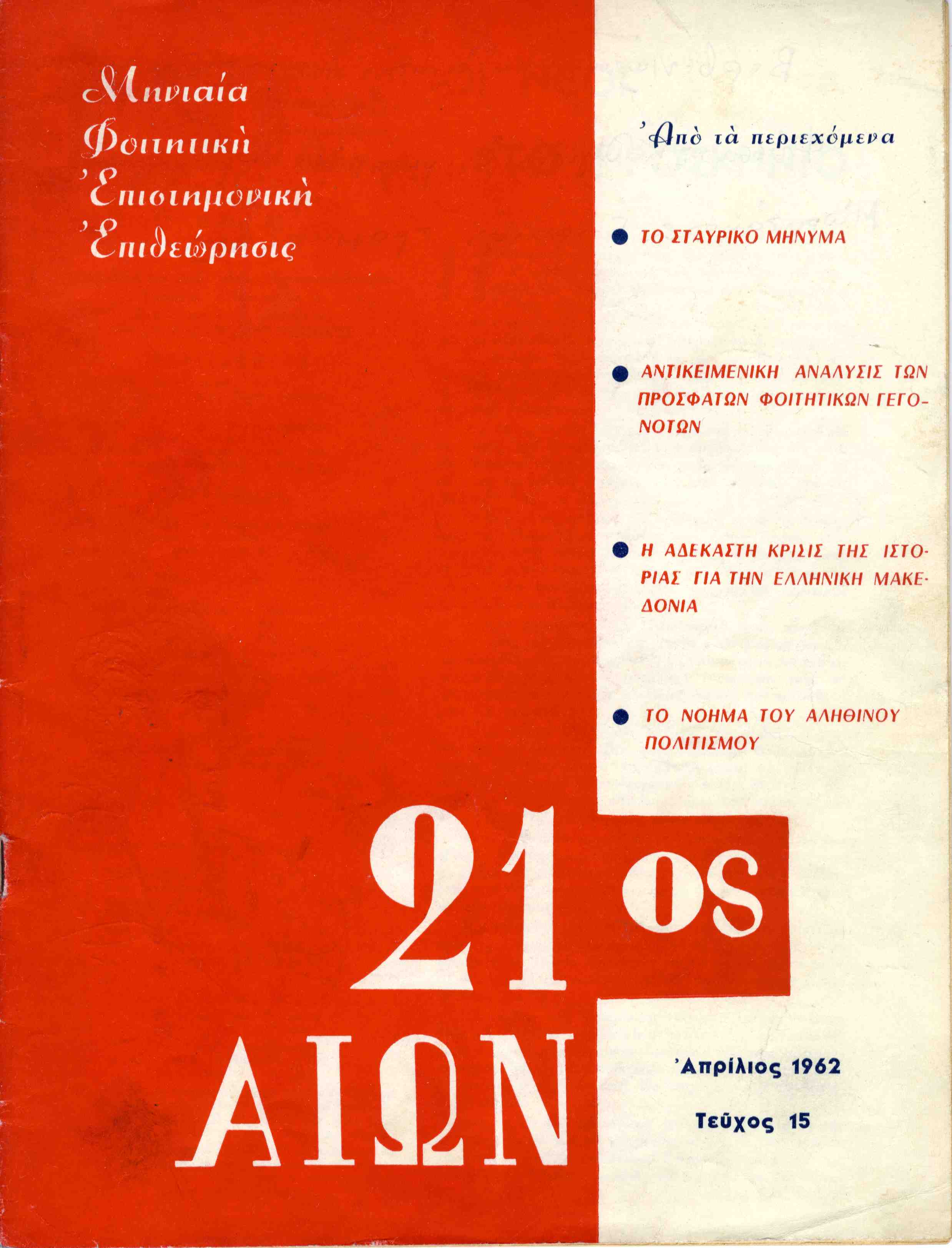 | Θέμα ως θέμα | Θέατρο (κριτικές) Θετικές επιστήμες Αντικομμουνισμός Εκπαιδευτικά ζητήματα Εκπαίδευση / Τριτοβάθμια Φοιτητικός τύπος Κυβέρνηση Καραμανλή Παγκόσμιο νεολαιΐστικο κίνημα Φοιτητικοί σύλλογοι |