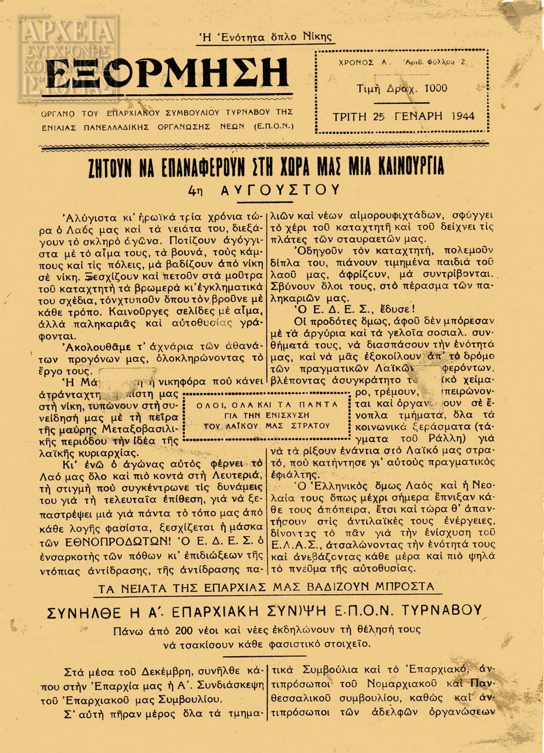 | Εκδότης | ΕΠΟΝ / Επαρχιακό Συμβούλιο Τυρνάβου |