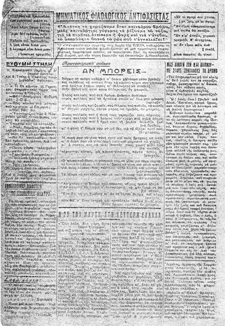 | Θέματα | ΕΛΑΣ (Ελληνικός Λαϊκός Απελευθερωτικός Στρατός) ΕΑΜ (Εθνικό Απελευθερωτικό Μέτωπο) ΕΠΟΝ (Ενιαία Πανελλαδική Οργάνωση Νέων) ΕΠΟΝ / Νομαρχιακά Συμβούλια ΕΠΟΝ / Τύπος ΕΠΟΝ / Εκπολιτιστική δράση - εξωραΐστικά έργα Πάτρα Μακεδονία Καβάλα |
