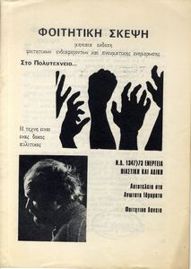 | Θέμα ως θέμα | 25η Μαρτίου / Επέτειος Ελληνικό Πανεπιστήμιο Δικτατορία 21ης Απριλίου 1967 Αντιδικτατορικός αγώνας Αρχαιρεσίες Ελληνικοί φοιτητικοί σύλλογοι Διεθνές φοιτητικό κίνημα Αντιδικτατορικός Τύπος εξωτερικού |